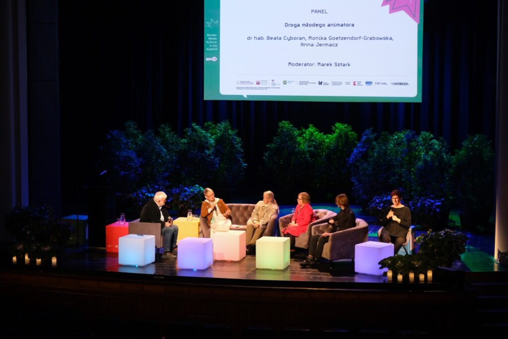 W kolejnych wystąpieniach uczestnicy mogli posłuchać Marka Sztarka z Dolnośląskiego Laboratorium Kultury Ośrodka Kultury i Sztuki we Wrocławiu, który w prezentacji pt. „Animacja z młodym” wskazywał, jak ważne jest tworzenie przestrzeni do wspólnego działania młodych i dorosłych animatorów. W panelu „Droga młodego animatora” eksperci: Anna Jermacz – Kierownik Działu Programów Dotacyjnych Narodowego Centrum Kultury, Monika Goetzendorf-Grabowska z Polskiego Komitetu Międzynarodowego Stowarzyszenia Wychowania przez Sztukę InSEA, dr hab. prof. UKEN Beata Cyboran z Instytutu Sztuki i Designu oraz moderator dyskusji Marek Sztark dzielili się doświadczeniami pracy z młodzieżą, pokazując różne ścieżki rozwoju w sektorze kultury.